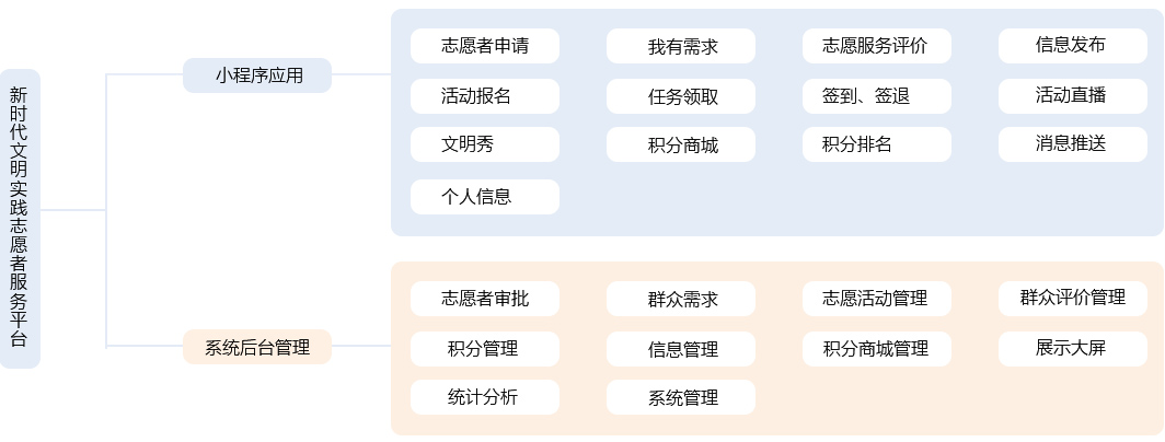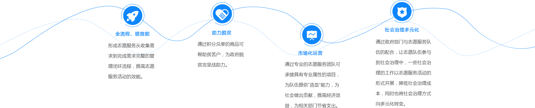 運用大數據信息化等科技手段,通過線上線下相結合的模式,打造一個內部管理有序,服務領域廣泛,服務能力一流,服務品牌鮮明,專業化規范化水平高的綜合志愿服務平臺。平臺貫穿整個志愿服務流程,以群眾點單、平臺亮單、中心派單、中隊接單、志愿送單、群眾評單再到積分兌單的七單模式形成志愿服務完整閉環。實現百姓需求隨時上報、及時處理、結果反饋,系統采用多層級管理、多維度統計分析、為領導決策提供有力的支持,讓志愿服務真正深入到基層。